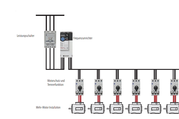 Obecně je možné provozovat několik elektromotorů stejné velikosti zapojených paralelně prostřednictvím frekvenčního měniče, což však vyžaduje větší úsilí. Například měnič frekvence by měl být navržen tak, aby byl o 20 % větší než celkový výkon pohonů. Měnič by navíc měl být provozován v režimu V/F. Důležitým bodem je ochrana jednotlivých motorů. Pro každý třífázový motor by měl být použit vhodný ochranný spínač motoru. Kromě toho musí být pro každý motor instalován hlídač teploty (PTC termistor).