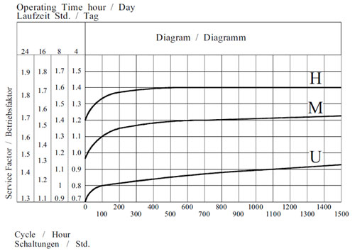 ''fs=1'' znamená rovnoměrné zatížení, 8 hodin denně a až 100 spínacích operací za hodinu. Provozní faktor závisí na: